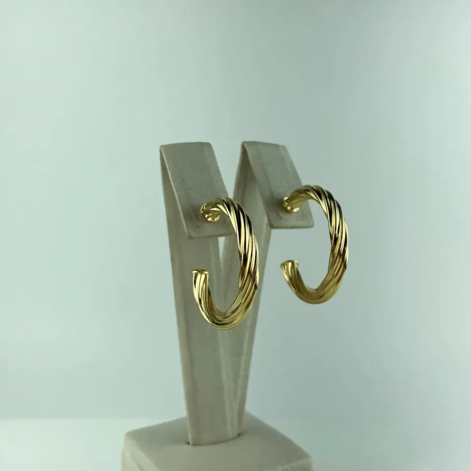 Apresentamos um brinco de argola com um toque especial de torção em sua estrutura. Uma peça artisticamente desenhada para criar uma dimensão visual única.